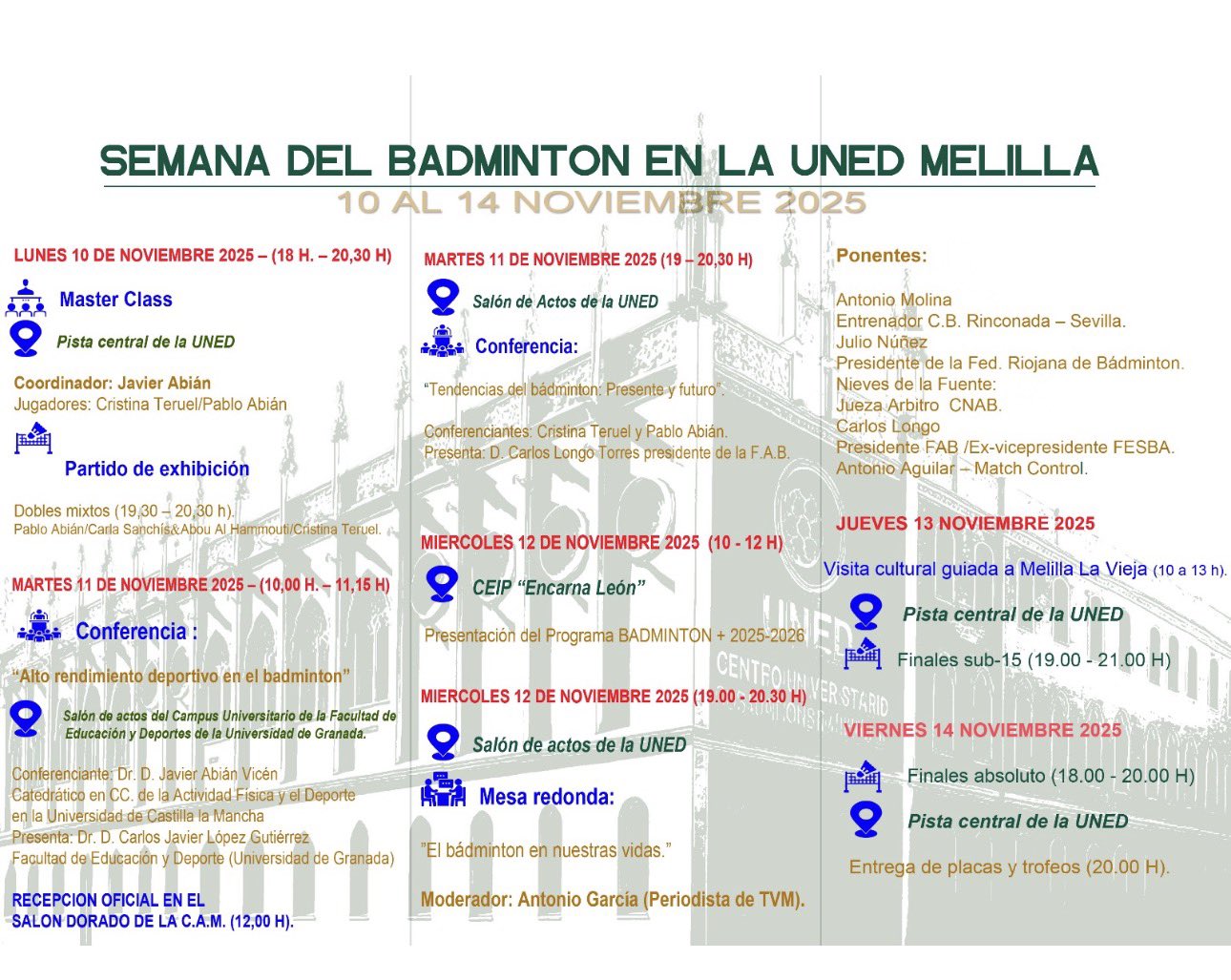 Semana del Bádminton Semana del Bádminton 📅 Del 10 de noviembre al 14 de noviembre de 2025 🏦 #UNEDMelillaTwitter